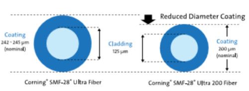 為了將更多的光纜擠進越來越小的空間,電纜制造商正在努力縮小電纜束的尺寸和直徑。例如,康寧公司(Corning)正在縮小400 Gb/s電纜的尺寸??祵嶴MF-28超高200光纖電纜的特點是涂層厚度只有200微米,低于以前產品的245微米,同時保持在單模光纖中直徑125微米的玻璃包層。
