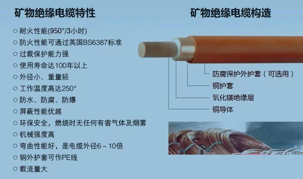 礦物絕緣電纜在火災條件下不僅能保證火災延續時間內(180分鐘以上)的消防供電,還不會延燃,不會產生煙霧,不會產生次生災害,從而為消防搶救贏得寶貴時間。